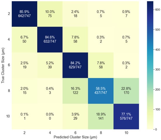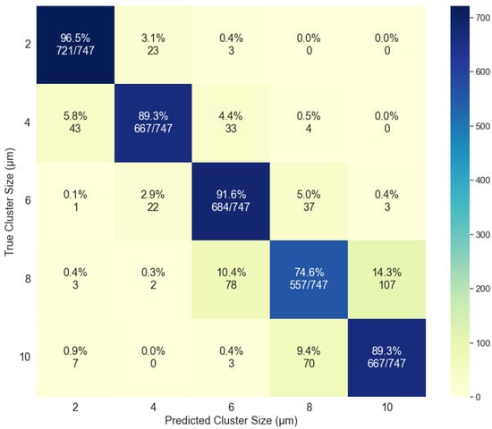 The MLP classifier performed the best during the cross-validation process (Section 2.3.2). The test data comprised 30% of the sample set corresponding to 747 images for each cluster size. The accuracy of the model was dependent on the data being classified: (1) cluster size forward scattering (2) cluster size backward scattering, (3) material composition forward scattering, and (4) material composition backward scattering. The accuracies were determined for each case to be: (1) 78.1%, (2) 88.3%, (3) 47.4%, and (4) 55.0%. The results were compiled and a confusion matrix was created for each condition. The confusion matrices for the cluster size classification are shown in Figure 8 and Figure 9 and illustrate good classification results. For the data based on the cluster size in the forward scattering direction (Figure 8), the average specificity was determined to be 94.5% while the average sensitivity was found to be 78.1%. The same analysis for the backward scattering data (Figure 9) yields 97.1% for the specificity and 88.3% for the sensitivity.