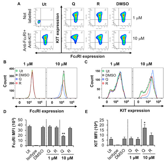 Effects of resveratrol and quercetin on FcεRI and KIT expression by MC/9. (A) MC/9 were treated with 1 or 10 μM quercetin (Q), resveratrol (R) or DMSO for 24 h followed by flow cytometry analysis. Ut represents untreated MC/9. FcεRI versus KIT expression contour plots were generated relative to the untreated unstained sample shown on the left-hand side panel. (B,C) Histogram overlay showing FcεRI and KIT expression by MC/9 treated with 1 or 10 µM Q, R or DMSO as in A. (D,E) Mean fluorescence intensity (MFI) of FcεRI and KIT expression by MC/9 treated as in A. n = 6. p values < 0.05 (*) and < 0.01 (**) are relative to DMSO control.
