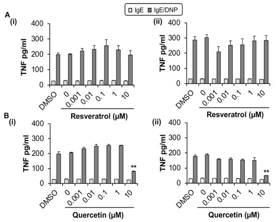 Effects of resveratrol (A) and quercetin (B) on TNF release by MC/9. (A,B) MC/9 (1 × 106 cells/mL) were sensitized with IgE and treated with resveratrol or quercetin (0–10 μM) and the DMSO control for (i) 1 h or (ii) 24 h followed by stimulation with 100 ng/mL DNP. n = 3. p value < 0.01 (**) is relative to DMSO control.