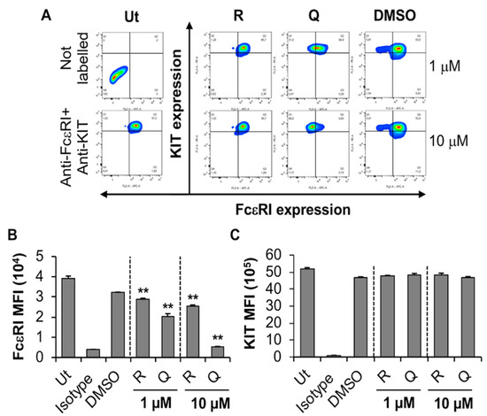 The effect of quercetin and resveratrol on BMMC expression of FcεRI was evaluated using flow cytometry and biocompatible concentrations (1 and 10 µM) of the phytochemicals (Figure 3). Resveratrol and quercetin significantly inhibited the expression of FcεRI in a concentration-dependent manner (Figure 3A, compare shift in contour plots of “Q” and “R” with DMSO; Figure 3B, compare dose-dependent reduction in FcεRI MFI of “Q” and “R” with DMSO) while having no effect on the expression of the KIT receptor (Figure 3C). Although DMSO appears to cause some shift in FcεRI expression in a subset of BMMC (Figure 3A, compare a small subpopulation in top-left hand side quadrant in DMSO treated sample with that of untreated, Ut), the overall shift in FcεRI expression in the entire population is only observed when BMMC is treated with resveratrol and quercetin. This effect is especially significant when BMMC are treated with 10 µM quercetin (Figure 3A,B, compare the shift of total cell population from top right-hand side quadrant in DMSO control to top left-hand side quadrant in 10 µM “Q” treated samples). Of the two compounds that were tested, quercetin showed the most potent effect on the expression of FcεRI, where a 38% to 83% reduction was observed with 1 and 10 µM, respectively (Figure 1B). In contrast, none of the compounds modified KIT expression on BMMC (Figure 3C). This suggests that quercetin and resveratrol significantly inhibit the expression of FcεRI without affecting KIT expression in primary mouse MC, BMMC, with quercetin and resveratrol having the most prominent effects at 10 µM.