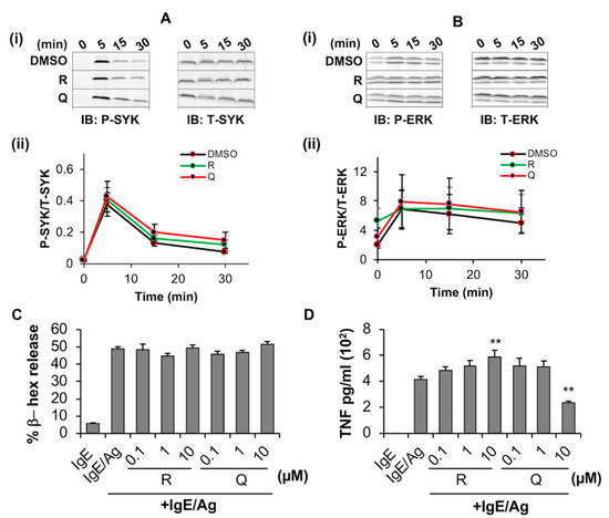 Effects of resveratrol and quercetin on SYK/ERK phosphorylation and degranulation by BMMC. (A,B) BMMC were treated with 10 μM resveratrol (R), quercetin (Q), or an equal volume of DMSO or media and incubated for 24 h while simultaneously exposed to 100 ng/mL of anti-DNP IgE. Activation of the IgE receptor was then induced by exposure to 100 ng/mL DNP-BSA for indicated times before lysis. Lysates were then probed via Western blot with antibodies towards phosphorylated (P) and (T) total SYK (A-i) and ERK1/2 (ERK, B-i). Densitometric analysis of the ratio between “P” and “T” stains are shown for SYK (A-ii) and ERK (B-ii) (n = 3). (C) BMMC were sensitized with anti-DNP IgE overnight and simultaneously treated with 0.1, 1 and 10 µM resveratrol (R) or quercetin (Q) for 24 h followed by stimulation with DNP-BSA and measuring the % release of β-hex (D). BMMC were sensitized with anti-DNP IgE overnight and treated with 0.1, 1 and 10 µM resveratrol (R) or quercetin (Q) for 24 h followed by stimulation with DNP-BSA and measuring the % release of TNF. n = 3. p value < 0.01 (**) are relative to IgE/Ag.