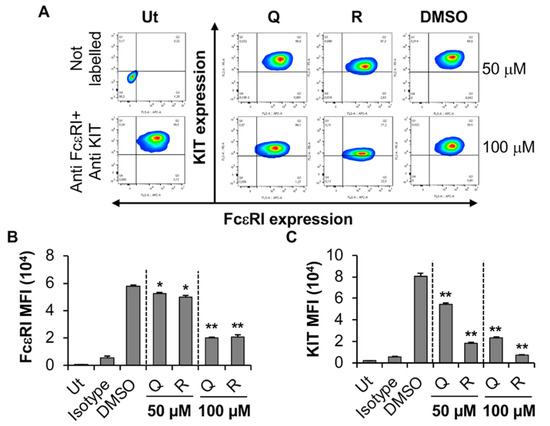 Effects of resveratrol and quercetin on FcεRI and KIT expression by LAD2. (A) LAD2 were treated with 50 or 100 μM quercetin (Q), resveratrol (R) or DMSO for 24 h followed by flow cytometry analysis. Ut represents untreated LAD2. FcεRI versus KIT expression contour plots were generated relative to the untreated unstained sample shown on the left-hand side panel. (B,C) Mean fluorescence intensity (MFI) of FcεRI and KIT expression by LAD2 treated as in A. n = 3. p values < 0.05 (*) and <0.01 (**) are relative to DMSO control.