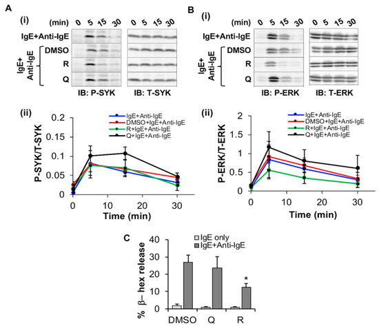Effects of resveratrol and quercetin on SYK and ERK phosphorylation and degranulation in LAD2. (A,B) LAD2 cells were treated with 50 μM resveratrol (R), quercetin (Q) and an equal volume of DMSO or media and incubated for 24 h while simultaneously exposed to 100 ng/mL of human IgE. Activation of the IgE receptor was then induced by exposure to 10 µg/mL anti-IgE for indicated times before lysis. Lysates were then probed via Western blot with antibodies towards phosphorylated (P) and total (T) SYK (A-i) and ERK1/2 (ERK, B-i). Densitometric analysis of the ratio between “P” and “T” stains are shown for SYK (A-ii) and ERK (B-ii). n = 3. (C) LAD2 cells were treated with 50 μM resveratrol (R), quercetin (Q) and an equal volume of DMSO or media and incubated for 24 h followed by sensitization with IgE for 6 h and measuring degranulation as % β-hex release, following 30 min stimulation with 10 µg/mL IgE. n = 5. Statistically significant data with p value < 0.05 are represented as *.