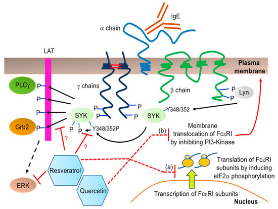 Schematic of FcεRI structure and signaling. The receptor is composed of 4 subunits: one α chain, one β chain and two γ chains joined by two disulphide bridges. When activated by IgE crosslinking, FcεRI phosphorylates and recruits adaptor proteins Lyn and SYK. Lyn phosphorylation of SYK, especially at tyrosine (Y) residues 348 and 352, and SYK’s autophosphorylation, leads to activation of SYK which then phosphorylates LAT, allowing for recruitment of PLC γ and Grb2. Resveratrol may inhibit this pathway downstream of tyrosine 348 phosphorylation, which is detected by the specific anti-phospho-SYK antibody used in this study. It may inhibit SYK autophosphorylation or phosphorylation of the downstream targets to ultimately prevent ERK phosphorylation. Some possible mechanisms by which resveratrol and quercetin might inhibit FcεRI surface expression include: (a) translation of FcεRI subunit mRNAs via inducing phosphorylation of eukaryotic initiation factor 2α (eIF2α) or (b) vesicular trafficking of FcεRI complex from endoplasmic reticulum to the plasma membrane via inhibiting phosphoinositide 3-kinase (PI3-Kinase).