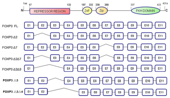 The FOXP3 gene is located at Xp11.23. It is a gene whose mutation leads to X-linked autoimmune diseases in mice and humans and is known as a specific marker of Tregs. The FOXP3 gene contains 11 coding exons and 3 noncoding introns. It includes the following: The N-terminal domain (1–132 amino acids), which contains a proline-rich repressor domain; the zinc-finger motif (197–222 amino acids); a leucine-zipper motif (239–260 amino acids), which promotes gene homo- and heterodimerization; and a C-terminal forkhead (FKH) domain (337–423 amino acids), which is a highly conserved DNA-binding site. FOXP3 encodes a variety of mRNA isoforms [14], including full-length FOXP3 (FOXP3 FL), the exon 3 deletion isoform (FOXP3-Δ3), the exon 2 deletion isoform (FOXP3-Δ2), the exon 3 and exon 4 deletion isoform (FOXP3-Δ3Δ4), the exon 7 deletion isoform (FOXP3-Δ7), the exon 2 and exon 7 deletion isoform (FOXP3-Δ2Δ7) and exon 2 and exon 3 deletion isoform (FOXP3-Δ2Δ3). These different isoforms, arising from alternative splicing, are expressed in different cell lines or tumor tissues and play different roles (Figure 2).