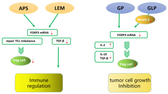 The efficacy of TCM in inhibiting tumor growth is also remarkable [66]. He et al. [67] found that the tumor weights of tumor-bearing mice in a purified glycyrrhiza polysaccharide (GP) treatment group were significantly decreased. The expression of FOXP3 and IL-10 mRNA was obviously decreased in the tumor-bearing mice of the treatment group, while the secretion of IL-12 was increased and the contents of IL-10 and TGF-β were decreased. GP may reduce the expression of FOXP3 and upregulate the ratio of Th1/Th2 in the serum, reducing the ratio of Tregs in the TME of H22 tumor-bearing mice and thus inhibiting tumor growth. Li et al. [68] found that a purified Ganoderma lucidum polysaccharide (GLP) treatment effectively suppressed the weights of tumors in a dose-dependent manner. The mechanism may be that GLP downregulates the expression of Notch1 through miR-125b to inhibit the expression of FOXP3 and eliminate the Tregs suppression of effector T cell (Teffs) proliferation by increasing IL-2 secretion (Figure 6).