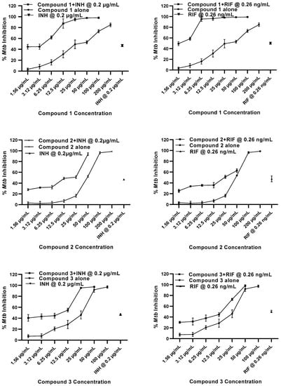 Compound | Concen-tration (µg/mL) | Compound Alone | Combination with 0.2 µg/mL INH | Combination with 0.26 ng/mL RIF | ||||