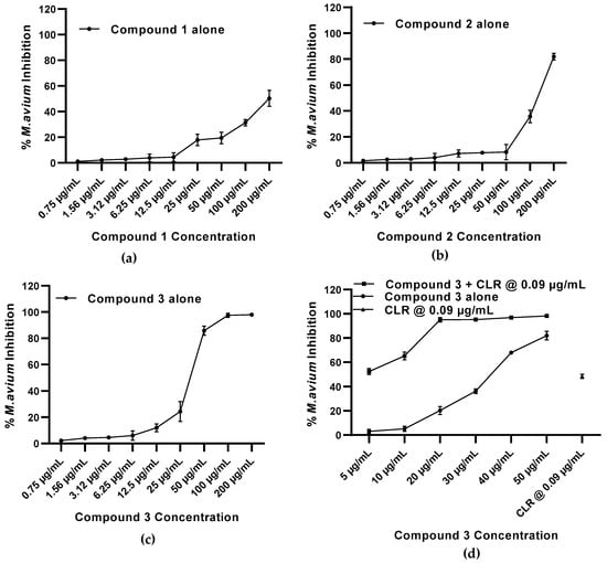 Compound | Concentration (µg/mL) | Anti-Mycobacterial Activity M. avium | |||
