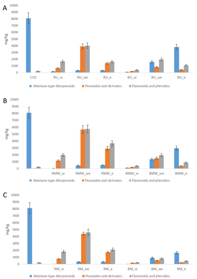 2.3. Quantitative Analysis of Secondary Metabolites in P. abies Extracts