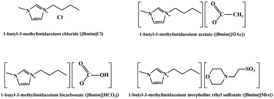 [Bmim]Mes was synthesized by the following process [36]. NaOH (0.12 mol, 4.8 g), morpholineethylsulfonic acid (0.1 mol, 21.3 g), and [Bmim]Cl (0.1 mol, 17.45 g) were dissolved in 200 mL of water. After stirring for 1 h at room temperature, the solvent was evaporated and a yellow-green viscous liquid was produced. A total of 500 mL of dichloromethane was added to the solution and stirred well to produce a white solid and a yellow-green liquid. The white solid was removed by filtration. The filtrate was evaporated at 60 °C to remove the solvent and then dried under vacuum to obtain [Bmim]Mes.