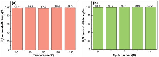 The easy regeneration of the desulfurization solution is very important for the desulfurization performance and economic cost of the whole desulfurization process. In this work, the regeneration of the desulfurization solution can be realized only by introducing air into the desulfurization solution after the desulfurization is completed. The effects of regeneration temperature and multiple desulfurization cycles on regeneration performance were investigated. The effect of regeneration temperature on the regeneration performance of the desulfurization system is shown in Figure 7a. The vertical axis represents the percentage of the amount of H2S removed to the total amount of H2S introduced within 10 h. It can be seen from the figure that the regeneration temperature has little effect on the regeneration performance. At 30 °C, the desulfurization solution can be easily regenerated, and the desulfurization efficiency after regeneration can reach 97.8%. When the regeneration temperature is 60 °C and 120 °C, the regeneration performance reaches the maximum value of 98.4%. From the perspective of energy saving, the lower the regeneration temperature, the better the energy-saving effect. Therefore, 60 °C was chosen as the regeneration temperature in this experiment. The multiple regeneration performance of (n-Bu4N)3VMo12O40/[Bmim]OAc is shown in Figure 7b. After four cycles of use, the desulfurization efficiency within 10 h can be maintained above 98.6%. It can be seen that (n-Bu4N)3VMo12O40/[Bmim]OAc is an efficient and easily regenerated desulfurization solution.