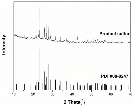As shown in Figure 8, the XRD pattern of the obtained desulfurization product is in good agreement with the sulfur standard card (PDF#08-0247), indicating that the obtained desulfurization product is elemental sulfur. The characteristic peaks at 23.04°, 25.84°, and 27.76° indicate that the obtained elemental sulfur is orthorhombic. This result indicates that the desulfurization solution (n-Bu4N)3VMo12O40/[Bmim]OAc converts toxic H2S into an economically valuable elemental sulfur resource.