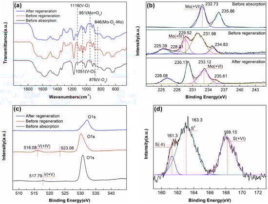 (a) FT-IR spectra, (b) XPS spectra of Mo 3d, and (c) XPS spectra of V 2p of samples before absorption as well as before and after regeneration. (d) XPS spectra of S 2p of samples after absorption.
