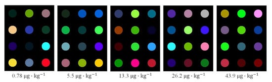 MATLAB software (Matlab R2016a, MathWorks, Natick, MA, USA) was used to filter the image information of colorimetric sensor array before and after the reaction. Then, the gray mean values of red (R), green (G), and blue (B) components within the radius of 12 pixels around the colored sensitive points were extracted, respectively, and normalized to 0–255. Then, the gray difference before and after the change in all kinds of sensitive points is calculated. In this way, three color difference components ΔR, ΔG, and ΔB of each corresponding color sensitive point can be obtained. Finally, the obtained ΔR, ΔG and ΔB were normalized, and the gray-scale image was superimposed to generate the characteristic image of the colorimetric sensor. In this study, each colorimetric sensor array had 12 color sensitive points, and each color sensitive point can obtain 3 color feature components. Thus, the colorimetric sensor eigenvalues of each peanut sample had 36 color components.