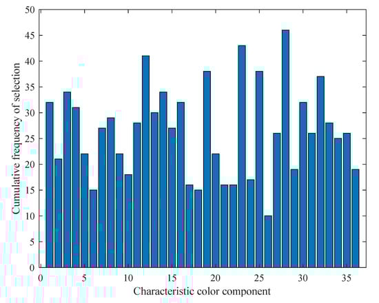 Figure 2 shows that statistics of the selected times of each color component after the GA-BPNN algorithm runs independently for 50 times. The results in Figure 2 show that all feature color components have been selected, and the color components with the lowest frequency have been selected 10 times. The result indirectly shows that the GA retains more variables in each variable optimization process, which may have a certain relationship with the GA optimization criteria. It can be clearly observed from Figure 2 that multiple characteristic color components are selected frequently. Especially for the 12th, 23rd, and 28th color components, their cumulative times all exceed 40. In each variable optimization process, three color components are almost selected, which indicates that three color components may effectively capture the changes in the AFB1 in moldy peanuts. They can be used as important color components to construct the AFB1 model of moldy peanuts. On the contrary, compared with most color components, some color components have less cumulative frequency during 50 independently runs of the GA-BPNN, such as the 6th, and 26th color components. These color components have relatively little correlation with the content of the AFB1 in moldy peanut. Therefore, in the later modeling process, these variables can be eliminated to improve the stability of the model.