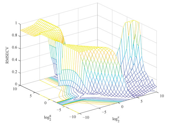 Table 2 shows the prediction results of two the SVR models based on different feature combinations. It is clear from the results of the GS-SVR model in Table 2 that the Case 2 prediction model obtains the best prediction performance. Although Case 3 mode selected the least feature color components, the performance of the GS-SVR model established by Case 3 mode was lower than of the GS-SVR model obtained by Case 1 and Case 2 mode. The fact indicates that the intrinsic features of the original data cannot be retained to a certain extent due to too few characteristic variables selected for modeling, which greatly reduces the prediction accuracy of model. Figure 3 shows the process of searching the optimal C and g value optimization of the SVR model based on the RBF kernel function in Case 2 mode. When C = 1.1, g = 0.50, the model achieved the best results, where RMSEP = 5.8, RP = 0.90, and RPD = 2.3.