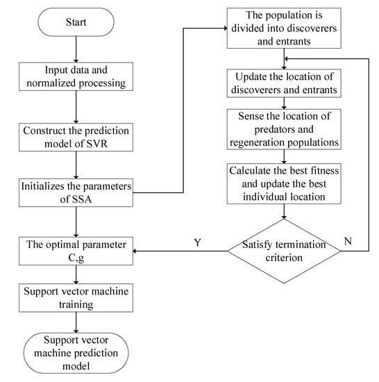 In this study, C and g in the SVR model are mainly optimized., and the model results are compared. Here, when the GS optimizes the parameters C and g of the SVR, their value ranges are 2−10,2−9.5, …, 29.5, 210. When the SSA optimizes the parameters C and g of the SVR, the population size is 20 and the maximum number of iterations is 100. The value range of C is set to 0.001–100, and the value range of g is set to 0.0010–1000.