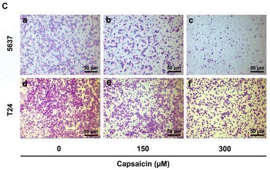 (C) Transwell migration assay for CAP treated 5637 (a–c) and T24 cells (d–f) at 0, 150 and 300 µM for 48 h. The scale bar for (a–f) is 50 µm.