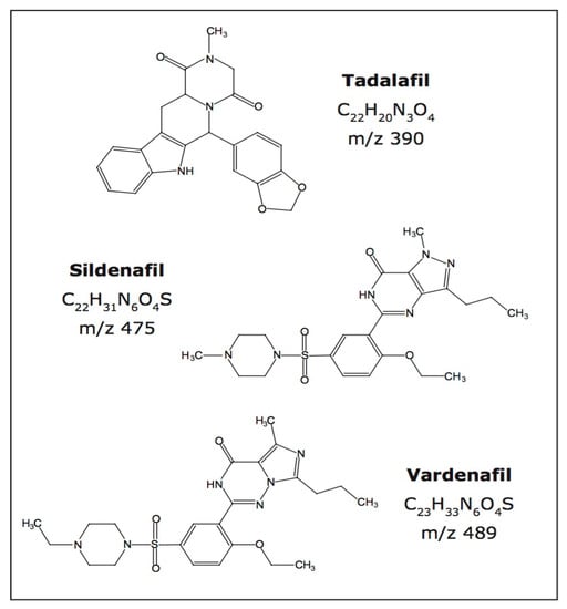 - Venhuis, B.J.; de Kaste, D. Towards a decade of detecting new analogues of sildenafil, tadalafil and vardenafil in food supplements: A history, analytical aspects and health risks. J. Pharm. Biomed. Anal. 2012, 69, 196–208. [Google Scholar] [CrossRef] [PubMed]