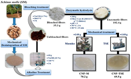 Schinus molle was used as raw material and obtained from the Gafsa region (south of Tunisia). The chemical composition of Schinus molle was determined by applying the standard methods. Schinus molle has a relatively high content of cellulose, 53.2%, followed by lignin (21.4%) and hemicelluloses (21%). The amount of extractive solubility in hot water, in 1% NaOH, and in ethanol–toluene was 38.2, 27.0, and 12.3%, respectively. The ash content was about 4% [48]. The quite large content of cellulose allowed for envisaging the development of such a biomass as a source of cellulose for the production of CNF.