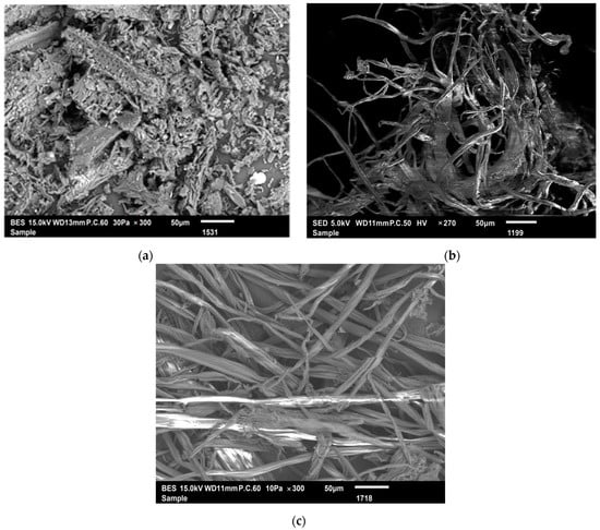 SEM observations of raw material (a), delignified fibers (b), and delignified, bleached fibers (c).