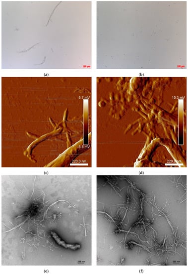 Optical observation of CNF–TSE (a) and CNF–M (b). AFM images of CNF–TSE (c) and CNF–M (d). TEM micrographs of CNF-TSE (e) and CNF–M (f).