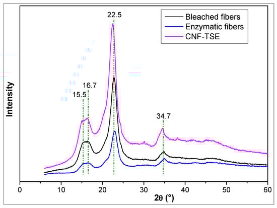 An example of XRD profiles of the bleached fibers, enzymatic fibers, and CNF–TSE.