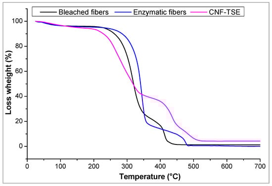 An example of the TGA profiles of the bleached fibers, enzymatic fibers, and CNF-TSE.