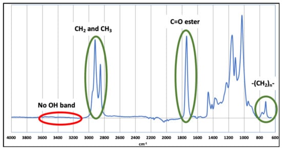 1H NMR spectra were performed in CDCl3 using a Bruker DRX-300 Spectrometer (operating at 300 MHz) to assess purity (lack of methyl laurate and pyridine-specific signals) and confirm the degree of substitution (DS) of FASE by an integration method described and proven in previous works for fatty acid cellulose esters [21,36,37]. In a typical experiment, 15 mg of FASE was dissolvent in 0.5 mL of CDCl3 prior to analysis.