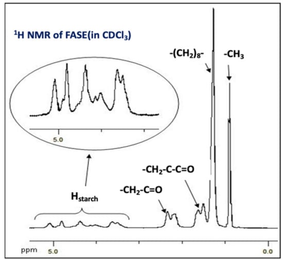 Starch acylation was also confirmed by 1H NMR spectroscopy. 1H NMR spectrum (Figure 2) attested to the presence of characteristic signals of fatty chain protons from 0.89 to 2.34 ppm and of the starch backbone from 3.00 to 5.50 ppm (Hstarch, carbohydrate protons). The degree of substitution (DS) of FASE was determined using the 1H NMR integrations method described in the literature for fatty acid cellulose esters [30]. DS was estimated at 2.95 ± 0.1, confirming the supposition emitted about FT-IR analysis that starch hydroxyl groups were totally grafted by fatty acid chains. Furthermore, 1H NMR was also used to confirm the lack of residual synthetic products, such as pyridine used during synthesis and fatty acid methyl ester-induced during reaction purification. No signal was observed either at 3.68 ppm for the methyl ester group or higher than 6.5 ppm for pyridine protons. To conclude, the FASE that will be used further as a hydrophobic additive in TPS formulation is pure and can be considered a fully substituted starch (DS = 3).