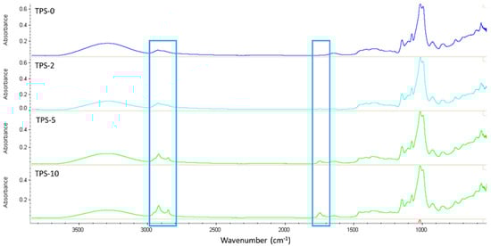 Homogeneous TPS/FASE extruded films were successfully obtained by introducing FASE powder into a TPS formulation. Figure 3 shows the FTIR spectra of TPS-0, TPS-2, TPS-5, and TPS-10 at the surface using ATR equipment to confirm the incorporation of FASE in TPS materials.