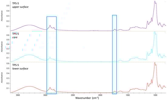 FTIR spectra for TPS-5 (upper surface, core and lower surface).