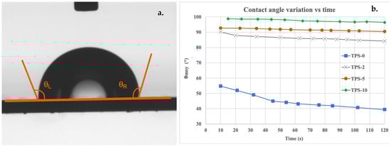 The study of the contact angle evolution as a function of time allowed us to check the effective hydrophobicity of the surface of TPS/FASE blends (Figure 6b). First, for TPS-0 results, a notable decrease in contact angles is observed, meaning that water drop was adsorbed in the support. Conversely, for each ratio of FASE, we can observe a slight decrease in the contact angle as a function of time. This slight decrease can be attributed to the evaporation of the water and not to the adsorption of the water in the support. After 2 min, despite the slight decrease in contact angles of TPS/FASE surfaces according to time, the TPS-2 surface is still more hydrophobic than the TPS-0 one (84° compared to 40° for TPS-0). Moreover, TPS-5 and TPS-10 surfaces remained hydrophobic with contact angle values of 90° and 96°, respectively.