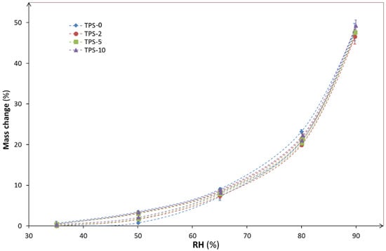 Dynamic vapor sorption measurements for TPS/FASE films are shown in Figure 7. All curves display similar shapes typical of starch-based materials [29].