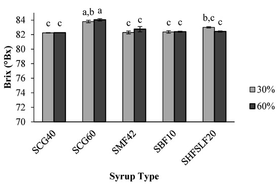 Effect of corn syrup type and concentration on the Brix of the formulated candies. Small letters indicate the significant differences (p < 0.05) between the samples. Each bar represents a different sample. Errors are represented as standard errors.