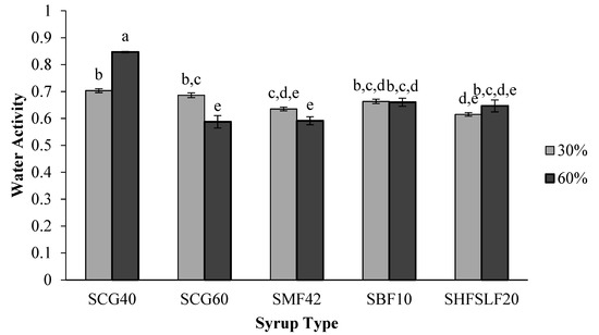 Effect of corn syrup type and concentration on the aw of the formulated candies. Small letters indicate the significant differences (p < 0.05) between the samples. Each bar represents a different sample. Errors are represented as standard errors.