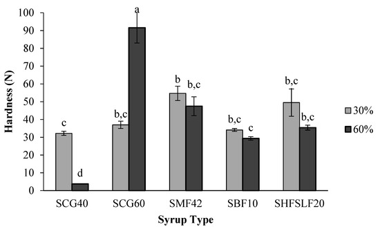 In addition to °Brix and aw experiments, hardness values of the candies were also measured (Figure 3). Corn syrup type and concentration were again significant on the hardness of the candies (p < 0.05). SCG60-60% samples had the highest hardness (p < 0.05) which was in agreement with their high °Brix and low aw values [15]. High Brix and low aw indicate that the water is entrapped within the candy matrix efficiently and homogeneously [16]. In contrast, both of the SCG40 candies, especially the one prepared with 60% corn syrup, were the softest samples. SCG40-60% showed a very soft texture that was below 10 N as shown in Figure 3. This is actually compatible with the substantially high aw of these samples. At such a high aw level, it is apparent that the continuous phase of the soft candies was not homogeneous due to the poor affinity of water with the sugar constituents of the samples [17]. Therefore, these candies could not preserve their shape and collapsed under even low forces. The remaining samples (SMF42, SBF10, and SHFSLF20) achieved statistically similar hardness values regardless of the corn syrup concentration used.