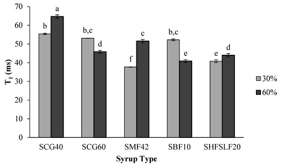 T1 data were fitted to a mono-exponential model. Both syrup type and concentration affected T1 significantly (p < 0.05). T1 values changed in the range of 35–65 ms and the longest T1 was observed for the SCG40-60% samples whereas the shortest T1 was observed for the SMF42-30% samples (Figure 4). When the syrup type was considered as the main factor, it was observed that SMF42 and SHFSLF20 samples had the shortest mean T1 (average of 30% and 60% syrup samples) values (p < 0.05). T1 is shortest when the molecular tumbling rate (also known as the correlation time, τc) is approximately equal to the Larmor frequency [6]. This tumbling rate also depends significantly on the viscosity/hardness of the sample. At lower viscosities/soft textures and higher free water populations, higher T1 values are expected for the same samples [18]. This could be the case for SCG40-60% candies whose aw reached the highest level. These samples had a higher proportion of free water molecules contributing to high aw and as a result, SCG40-60% samples attained the longest T1 (p < 0.05).