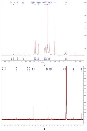 1H NMR and 13C NMR spectra of Dextran-RhB (a,b) and SD-Dextran-RhB (c,d).