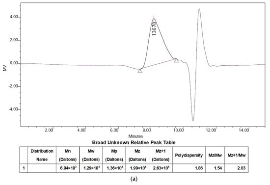 The molecular weight was measured using gel permeation chromatography (GPC). The first peak presented the normal average number weight of the sample. The other peaks appeared at the last period and eluted from GPC column later, which also presented the solvent of water. Average number molecular weight (Mn) of SD-Dextran-RhB was 5.51 × 103 and the polydispersity index was 1.96 (Figure 3). The molecular aggregation structure of SD-Dextran-RhB in the solution changed due to the attachments of RhB and SD to dextran, which induced the reduction in Mn of SD-Dextran-RhB. Thus, these results exhibited that RhB and SD were covalently bonded to dextran.