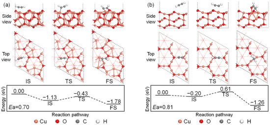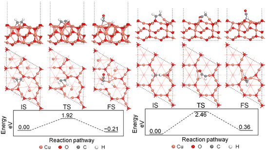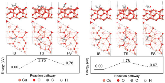 The reaction between a chemisorbed C2H2 and an adsorbed atomic H via the LH mechanism is further studied in this section. The neighboring adsorbed atomic H, as shown in Figure 5, is bonded to the surface unsaturated CuCUS site, and it could attack the chemisorbed C2H2 and form an adsorbed H2 and an adsorbed HCCO species together with a lattice OCUS. The reaction process is endothermic with energy adsorption of 0.78 eV, and the energy barrier is 2.75 eV. The chemisorbed C2H2 could also react with an adsorbed H together with the lattice O to form a CH2CHO species, as shown in the right part of Figure 5, on the perfect Cu2O (111) surface model. The energy barrier of the reaction process is 1.78 eV, which is lower than that of the H-abstraction reaction of the adsorbed C2H2 with an energy barrier of 2.75 eV. In terms of the reaction energy, the formation of CH2CHO needs to adsorb 0.67 eV, while the H-abstraction process adsorbs 0.78 eV. Therefore, the adsorbed C2H2 is more likely to be converted to CH2CHO when reacting with an adjacent adsorbed H together with a lattice OCSS site on the perfect Cu2O (111) surface model.