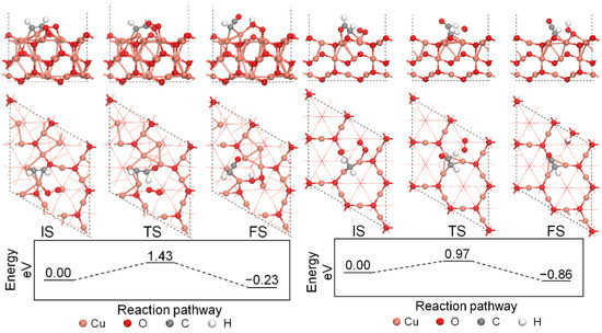 A higher computational accuracy has been used in the current work compared with our previous works [29,34]. The orbital cut-off has increased from 4.0 to 4.4 Å, and the convergence threshold of the self-consistent field (SCF) has increased to 1.0 × 10−6 from 1.0 × 10−5. The convergence criteria of energy, maximum force, and maximum displacement are 1.0 × 10−5 Ha, 0.002 Ha/Å, and 0.005 Å, respectively. For the crystal optimization, a 4 × 4 × 4 Monkhorst–Pack k-point grid was used. The surface planes were built by cleaving the Cu2O (111) surface from the optimized Cu2O crystal. A sheet of 10 Å vacuum layer was placed over the surface slab to avoid interference from imaging surface planes due to the periodic boundary conditions. The defective surface model was established by removing the top and bottom layer unsaturated CuCUS sites. A 3 × 3 × 1 Monkhorst–Pack k-point grid was used for the energy calculations of the succeeding surface reactions.