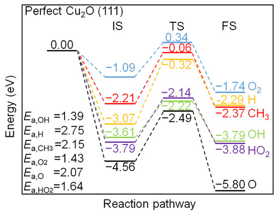 The energy profile of the interaction between the chemisorbed C2H2 species and the pre-adsorbed oxygen molecule and radicals, including H, OH, O, HO2, and CH3, on the perfect Cu2O (111) surface model are compared in Figure 6. The IS state also incorporates the energy release of various radicals on the surface unsaturated CuCUS site after adsorption. The interaction between the O radical and the surface releases the largest amount of energy (−4.56 eV after adsorption), followed by HO2, OH, H, CH3 radicals, and O2 with the adsorption energy of −3.79, −3.61, −3.07, −2.21, and −1.09 eV, respectively. The energy barriers have been listed in the left corner of Figure 6. The H-abstraction of the chemisorbed C2H2 by OH and O2 have similar barriers, which are 1.39 and 1.43 eV, while the H-abstraction reactions by adsorbed HO2, H, CH3, and O radicals need to overcome higher energy barriers, which are 1.64, 2.75, 2.15, and 2.07 eV. The H-abstraction reactions by all the adsorbed radicals considered are exothermic except for H radical, indicating that the H-abstraction reactions on the perfect Cu2O (111) surface model is thermodynamically favorable.