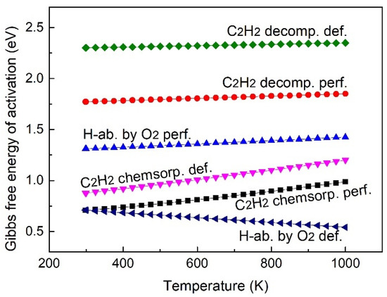 The above-mentioned discussions are based on the DFT calculation results at 0 K, and the rate constants at elevated temperatures are more relevant to the real circumstances, and the temperate dependence of elementary reaction rates is discussed in this section. The Gibbs free energy of activation (ΔG) of the elementary reactions, including the C2H2 chemisorption, C2H2 direct decomposition, and H-abstraction of C2H2 by O2, are shown in Figure 8. ΔG denotes the Gibbs energy difference between the transition state and the initial state, and a larger ΔG corresponds to a smaller reaction rate constant at a given temperature according to the transition state theory. Except for the reaction of H-abstraction by O2 on the defective Cu2O (111) surface model, the ΔG of all the considered reactions are positively correlated to the temperature. For the reactions of C2H2 chemisorption and the direct decomposition of the chemisorbed C2H2 into an adsorbed C2H and an atomic H species, the perfect Cu2O (111) surface model shows better performance over the defective Cu2O (111) surface model, while the H-abstraction process is more favorable on the defective Cu2O (111) surface model than the perfect one, so the defective surface could facilitate the H-abstraction process of C2H2 by O2.
