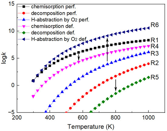 The reaction rate constants of elementary reaction steps are further calculated based on transition state theory, and the rate constants including C2H2 chemisorption, C2H2 direct decomposition, and the H-abstraction of C2H2 by O2 are presented in Figure 9. The C2H2 chemisorption process is more active on the perfect Cu2O (111) surface model than on the defective Cu2O (111) surface model, and the reaction rate is about one order of magnitude higher. The C2H2 direct decomposition rate constants are the slowest regardless of the perfect or the defective Cu2O (111) surface models compared with other elementary reaction steps considered in Figure 9, and the rate on the defective surface model is slower than on the perfect surface. The rate constant of H-abstraction by O2 on the defective surface model is remarkably higher than on the perfect one, and the rate constant is faster by about 4.4 orders of magnitudes at 1000 K. Therefore, the perfect Cu2O (111) surface model is more favorable for the C2H2 chemisorption process, while the defective surface model could be beneficial for the H-abstraction reaction of C2H2 by O2 over the considered temperature range from room temperature to 1000 K. In terms of the reaction rate constants, the direct decomposition of C2H2 is less likely to proceed compared with the H-abstraction process. Therefore, the chemisorption and the succeeding H-abstraction process by O2 could be the possible partial oxidation reaction pathway of C2H2 on the Cu2O (111) surface model. The chemisorption of C2H2 is the rate-determining step on the defective Cu2O (111) surface model, and the H-abstraction by the O2 process is the rate-determining step on the perfect Cu2O (111) surface model.