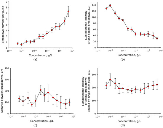 Usually, with an increase in the number of individual optical breakdowns induced by a single laser pulse, a decrease in the intensity of plasma formation in each individual optical breakdown is observed. The intensity of plasma formation was estimated from the luminescence intensity of individual optical breakdowns. It was shown that the concentration of BSA molecules in the aqueous solution had a significant effect on the average luminescence intensity of individual optical breakdown (Figure 1b). With an increase in the BSA concentration from 5 × 10–4 g/L to 0.1 g/L, the average intensity of the luminescence of individual optical breakdown decreased exponentially by almost three times, from 140 to 50 units. At concentrations of more than 0.1 g/L, the average intensity of the luminescence of individual optical breakdown did not change, and was in the range of 35–45 units.
