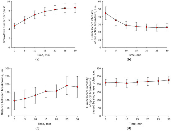 An estimate was made of the average distance between optical breakdowns caused by one laser pulse as a function of the time of exposure to laser radiation on an aqueous solution of BSA (Figure 2c). It was established that the average distance between individual breakdowns caused by a single laser pulse increased from 100 µm at the beginning of irradiation to 180 µm after 30 min of exposure to laser radiation. The influence of the time of irradiation of aqueous solution of BSA with a laser on the average luminescence intensity of all optical breakdowns induced by a single laser pulse was estimated (Figure 2d). It was shown that the average intensity of the luminescence of optical breakdowns caused by a single laser pulse did not change during at least 30 min of exposure to laser radiation on aqueous solutions of BSA. In this case, during the entire 30 min of exposure to laser radiation, there was a trend towards an increase in the average luminescence intensity (the intensity increased by 10% in 30 min).