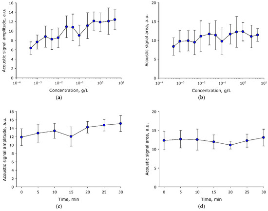 Influence of BSA aqueous solution irradiation time and its concentration on the characteristics of acoustic oscillations induced by optical breakdown (n = 3, Mean ± SEM). (a) Effect of the concentration of BSA molecules in aqueous solution on the average amplitude of acoustic vibrations induced by optical breakdown. (b) Effect of the concentration of BSA molecules in aqueous solution on the average intensity of acoustic vibrations induced by optical breakdown. (c) Effect of the time of irradiation of aqueous solution of BSA (1 mg/mL) with a laser on the average amplitude of acoustic oscillations induced by optical breakdown. (d) Influence of the time of irradiation of aqueous solution of BSA (1 mg/mL) with a laser on the average intensity of acoustic oscillations induced by optical breakdown.