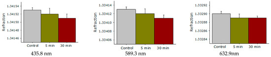 The effect of laser irradiation time on the refractive index of the BSA solution at wavelengths of 435.8 nm, 589.3 nm, and 632.8 nm was studied (Figure 7). It was shown that the BSA refractive index does not change significantly after exposure to laser radiation at all investigated wavelengths.