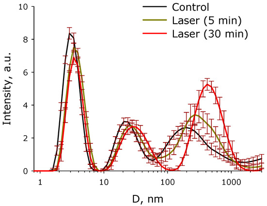 The influence of the time of exposure to laser irradiation on the evolution of the BSA and its aggregates size distribution in an aqueous solution was studied (Figure 9). It was shown that the intact preparation contains individual BSA molecules (the average hydrodynamic diameter is approximately 3 nm), as well as aggregates (the average hydrodynamic diameters are 25 and 200 nm). There are ~1.1 × 106 individual BSA molecules per one 25 nm aggregate in solution, and ~2.9 × 1010 individual BSA molecules per one 200 nm aggregate. When exposed to laser radiation, there is no increase in the average hydrodynamic diameter of individual BSA molecules. At the time of exposure to laser radiation, a decrease in the intensity of light scattering by 10–15% on individual molecules is clearly visible. For 30 min of laser exposure, the hydrodynamic diameter of “small” aggregates increases from 25 nm to 30 nm, and the hydrodynamic diameter of “large” aggregates increases from 200 nm to 400 nm. At the same time, the intensity of light scattering on such “large” aggregates increases by almost two times. After exposure to laser radiation for 30 min, one aggregate with a size of 400 nm accounted for ~3.7 × 1012 individual BSA molecules. The same number of “large” aggregates increased by more than 30 times. In general, the dose-dependent nature of the changes was visible. As the time of laser exposure increased, the changes in the evolution of the size distribution became more and more pronounced.